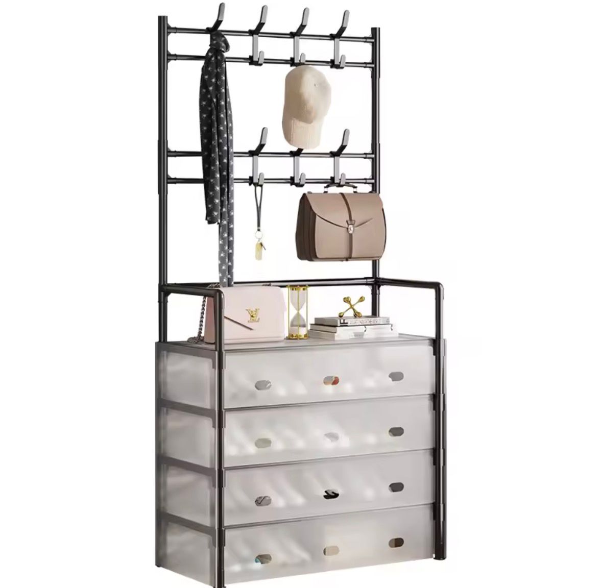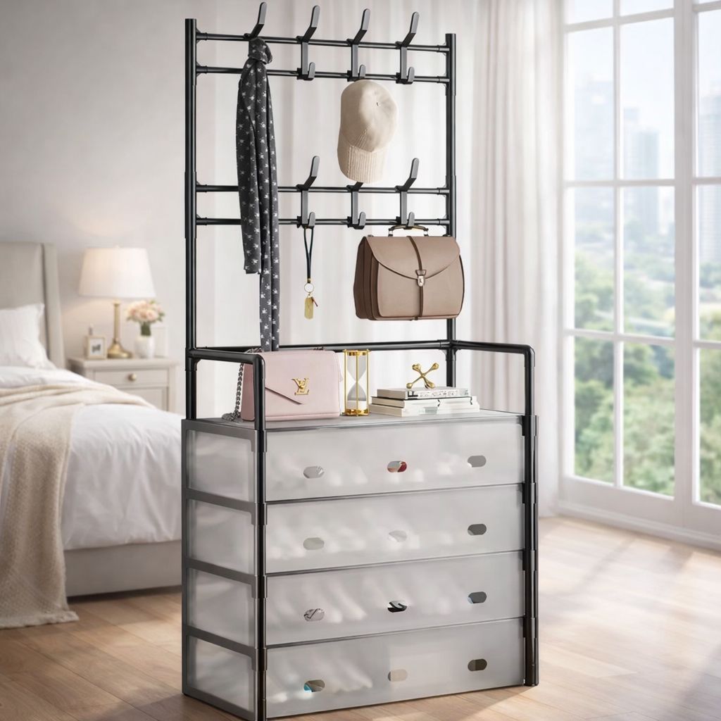 This versatile unit combines a top hanging rack with multiple hooks and spacious drawers below, making it perfect for organizing clothes, accessories, and daily essentials—all in one compact design.